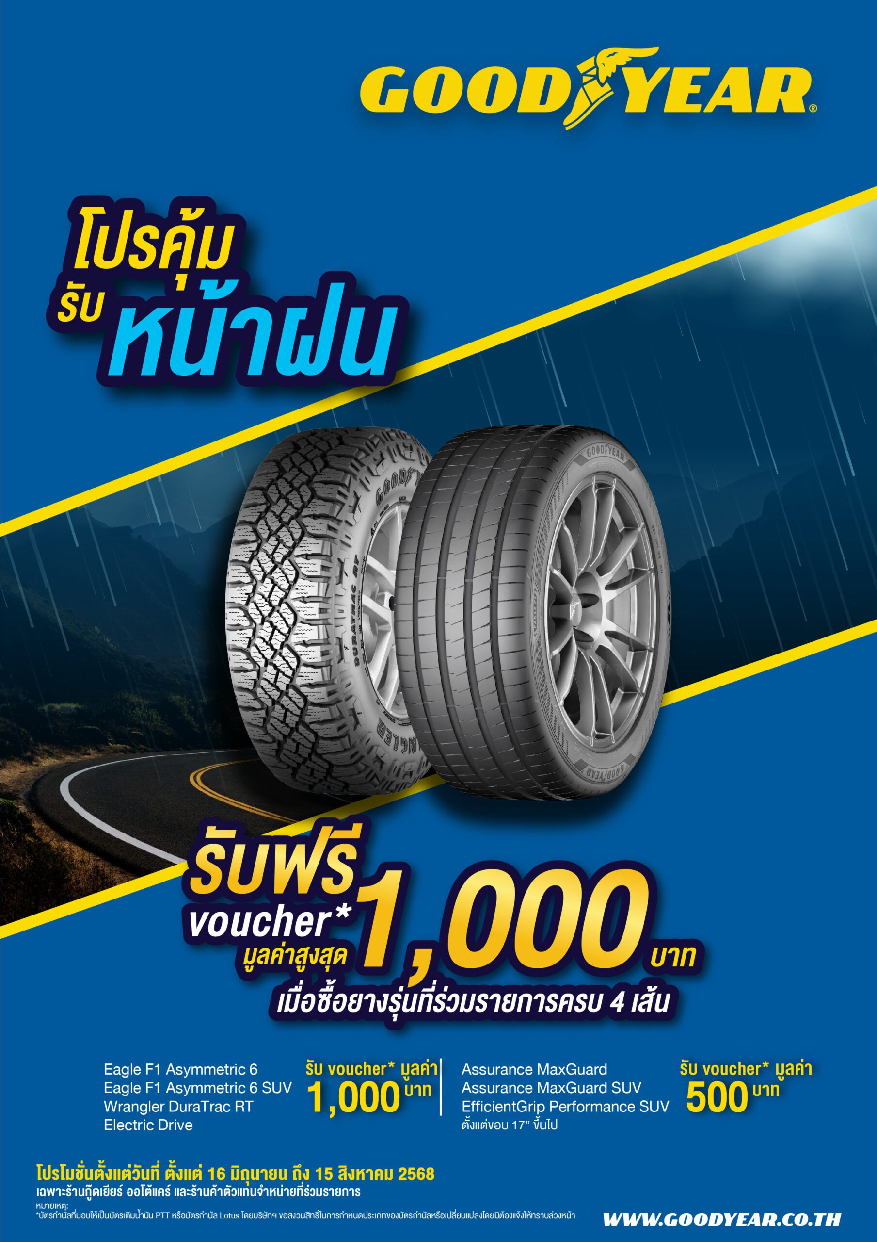 เมื่อซื้อยางกู๊ดเยียร์รุ่นที่ร่วมรายการ ครบ 4 เส้น รับฟรี voucher* มูลค่าสูงสุด 1,000 บาท